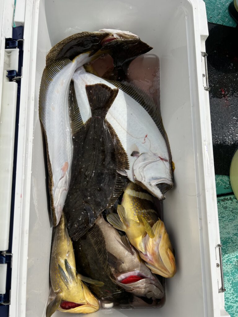 泳がせで出船、土曜に通過した爆弾低気圧のウネリが、まだ残っていて底荒れおさまっておらず厳しい釣りになると思っていましたが潮流れがあり、何とか本命見れました!K&K様、寒い中、頑張って頂きありがとうございました!ヒラメ0.6〜1.4kgを8枚、マハタ、コモンハタ、アオハタ